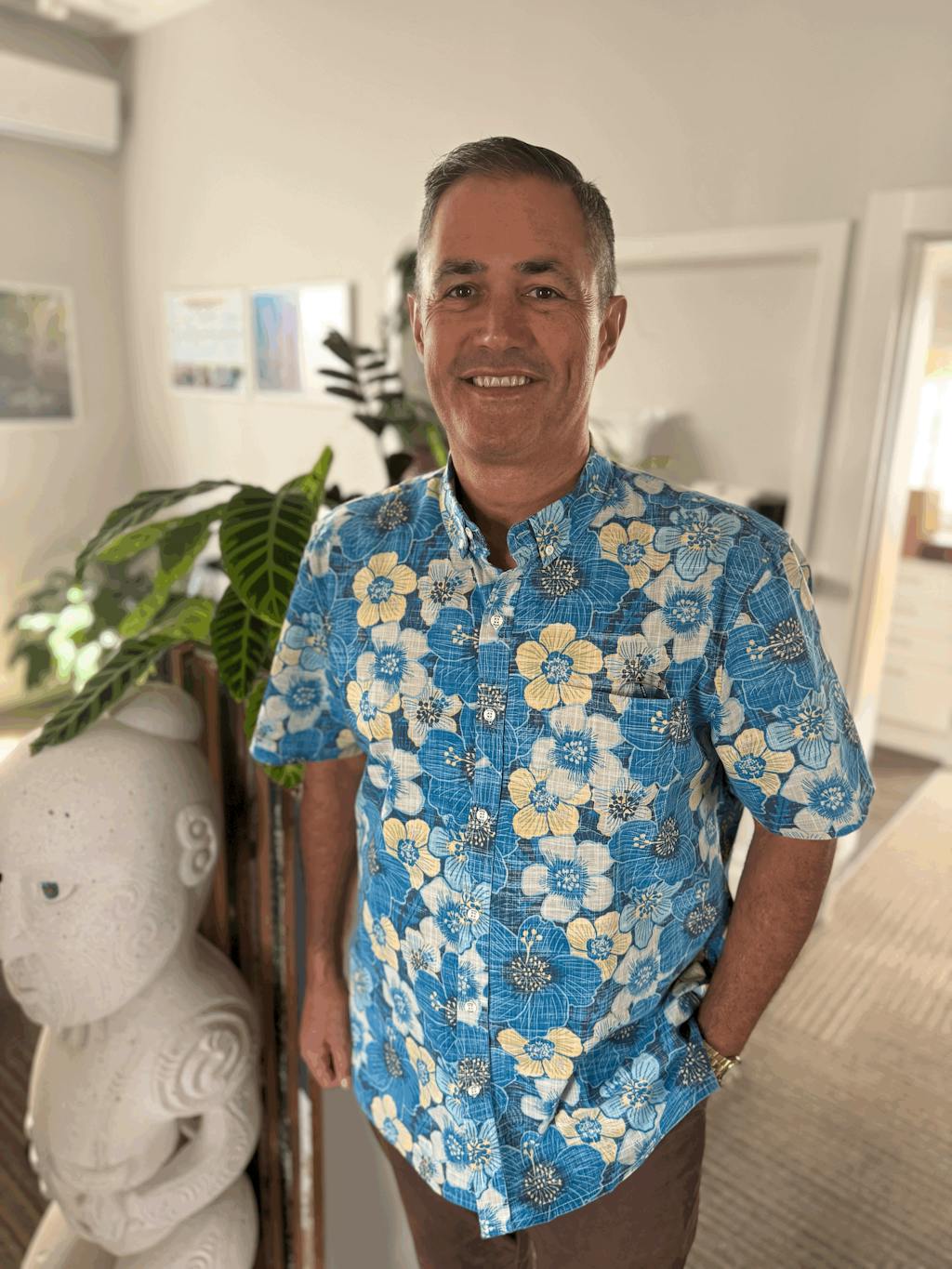 Whitinga O Te Rā Kiwi Classic Short Sleeve showcases Kaleo’s wearable art New Zealand – an exclusive Anita Rademacher print designed in the Bay of Islands for premium men’s shirts NZ. Crafted in our custom-weave fabric for structure and comfort, this travel-friendly, no-iron shirt features reverse-printed texture, matched pocket and branded details for smart casual style; available in Relaxed or Tailored fits.
